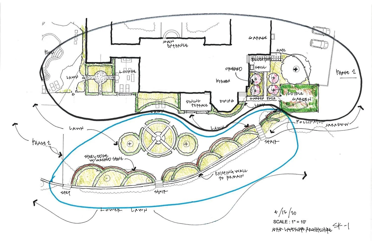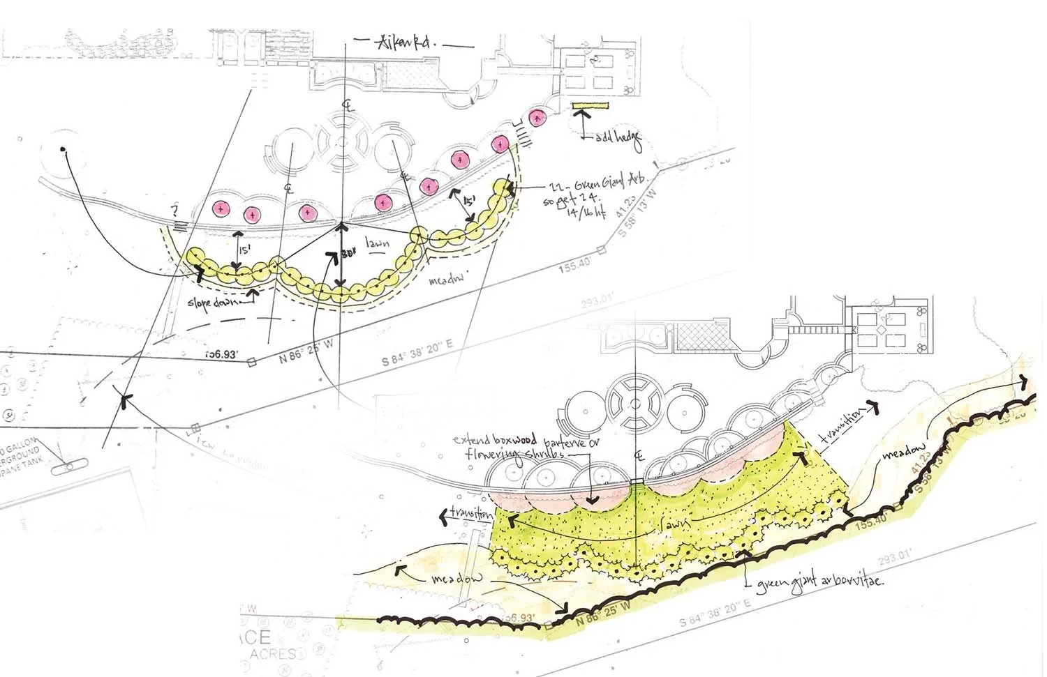 site grading; construction of barns; installation of pavement, shed structure, furniture and plant materials